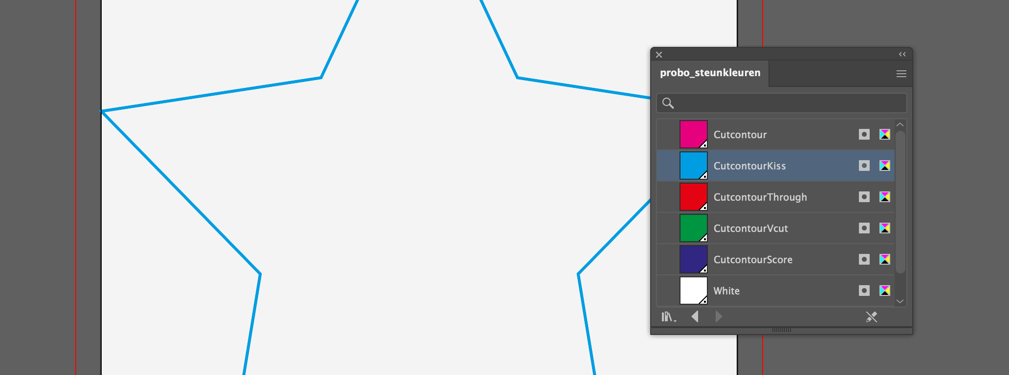 - Je kunt onze steunkleurenbibliotheek downloaden en importeren in je stalenvenster in Illustrator. Zo heb je alle steunkleuren altijd bij de hand hebt. Lees om perfect voorbereid te zijn ook het artikel over het maken van een cutcontour.