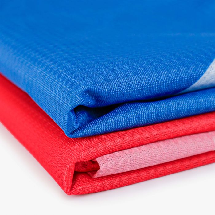 Flag Longlife is een sterk polyester doek met een grove structuur. Het materiaal is licht geperforeerd en rafelt hierdoor nauwlijks. Het is dan ook niet nodig om dit materiaal te zomen. Dankzij de structuur van het materiaal zijn de vlaggen bij een lage windkracht al duidelijk zicht- en leesbaar.