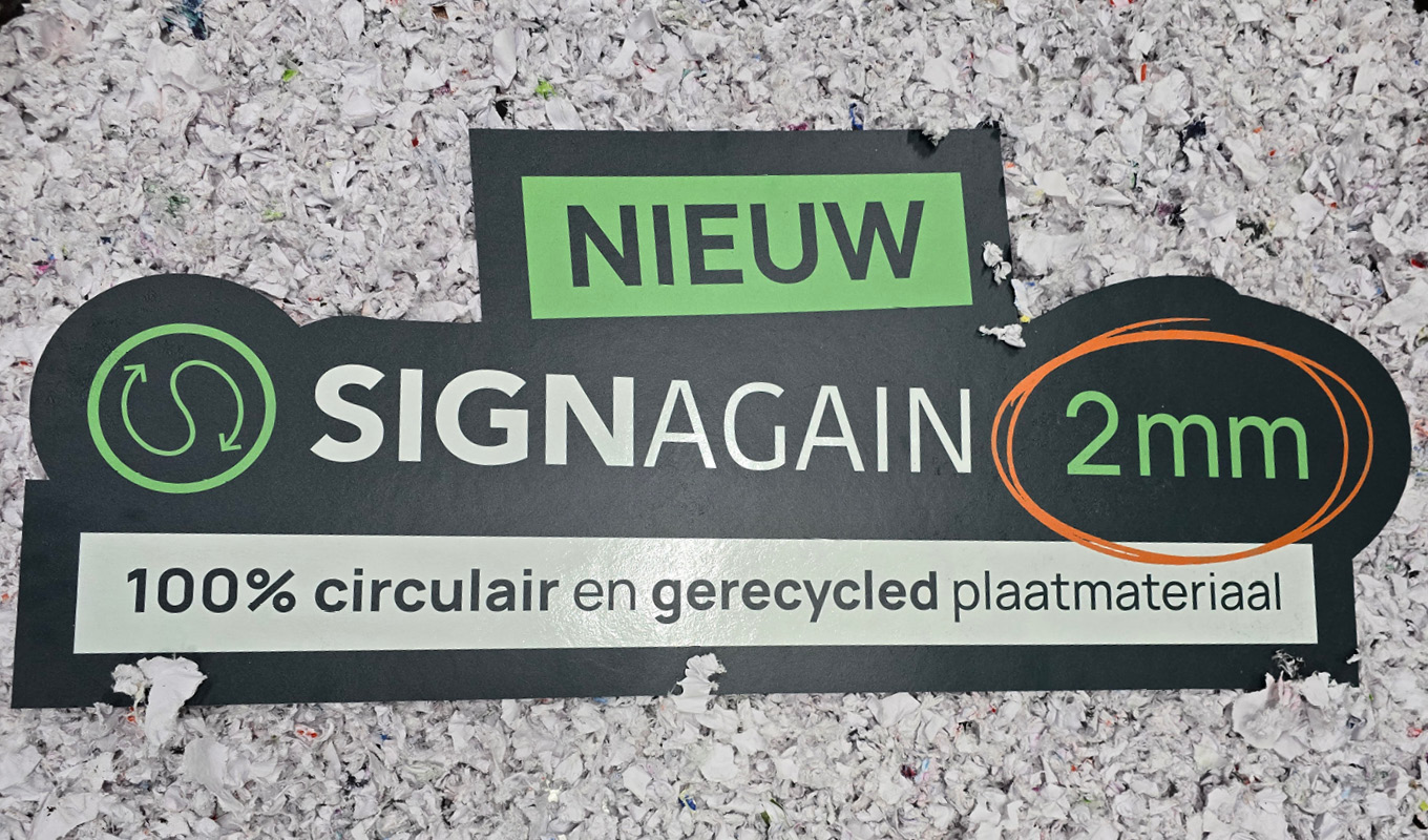 Sign Again is het allereerste volledig (close loop) gerecyclede plaatmateriaal. Hiervoor verwerken we snijresten en gebruikte prints tot nieuw te beprinten plaatmateriaal. Door materialen te recyclen, kunnen we de productie van nieuwe grondstoffen verminderen en de hoeveelheid energie die nodig is om deze materialen te produceren en verwerken verminderen. Dit heeft veel voordelen voor het milieu.