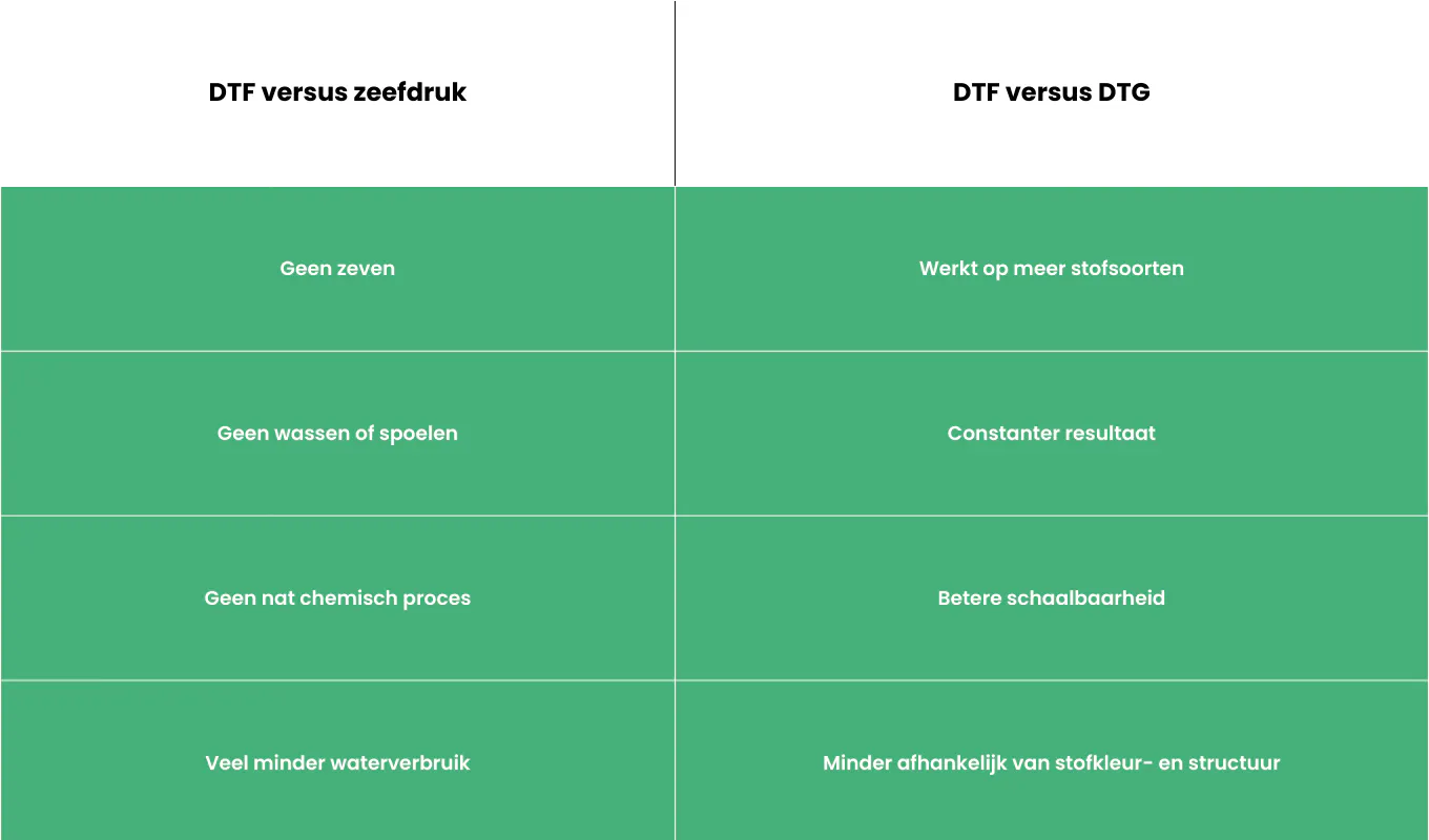 Het verschil met zeefdruk en DTG (direct to Garment)