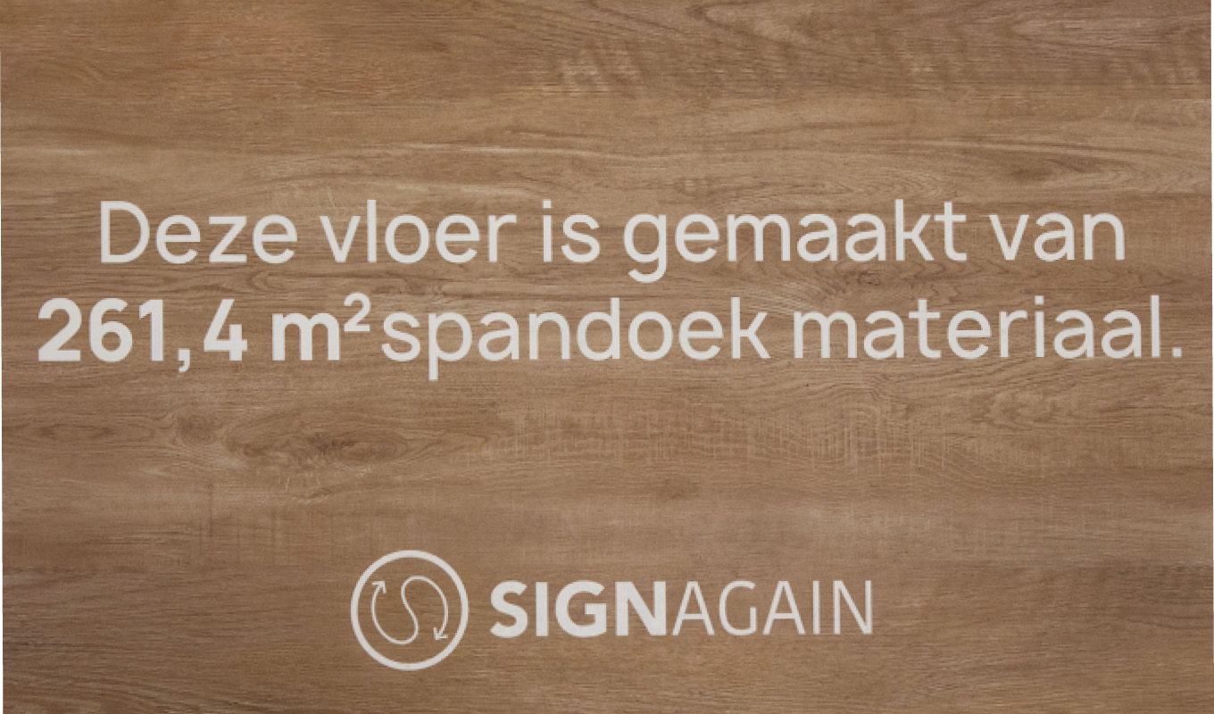 Tjalling: ''Sign Again® is het allereerste 100% gerecyclede plaatmateriaal, waar innovatie en recycling elkaar ontmoeten. Sign Again® is het meest veelzijdige plaatmateriaal doordat het ontzettend sterk, slag- en krasvast, B1 brandveilig én buigzaam is. Het materiaal is makkelijk te verwerken en het basismateriaal is een combinatie van de sterkte punten van Forex en Dibond. Het kan zowel binnen als buiten worden gebruikt. Omdat Sign Again® gemaakt is van snijafval en gebruikte spandoeken, heeft het de laagst mogelijke footprint.''