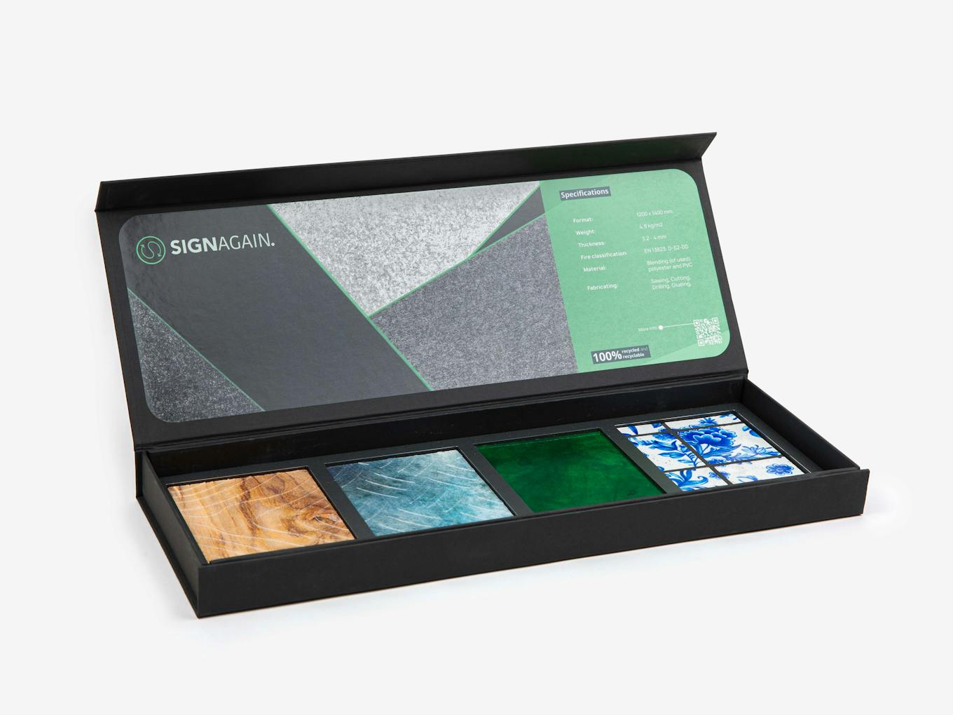 Tjalling: ''Een nieuw materiaal vraagt ook om genoeg promotiemateriaal die jij weer kan gebruiken om de opdracht op Sign Again® binnen te slepen. Want we snappen dat je dit materiaal zelf wil zien en voelen. Daarom ontwikkelden wij de Sign Again® samplebox. Zo ontdek jij alle mogelijkheden van het allereerste gerecyclede en volledige circulaire plaatmateriaal. De box bevat de twee verschillende plaatdiktes en vier verschillende samples met structuren. Je kunt de box hier bestellen.