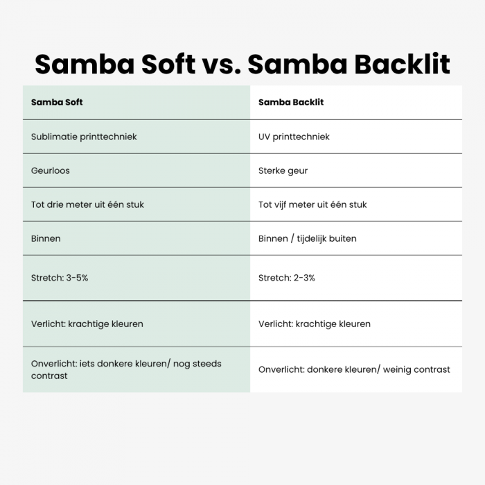 Samba Soft is gemaakt van 100% polyester. Het is een backlit peesdoek die lichtdoorlatend is. Het licht wordt gelijkmatig verspreid en zorgt voor een helder en scherp beeld. Het heeft extra fijne garen en krijgt een dubbele laag inkt. Samba Soft is perfect voor verlichte toepassingen maar ook geschikt voor onverlichte toepassingen.